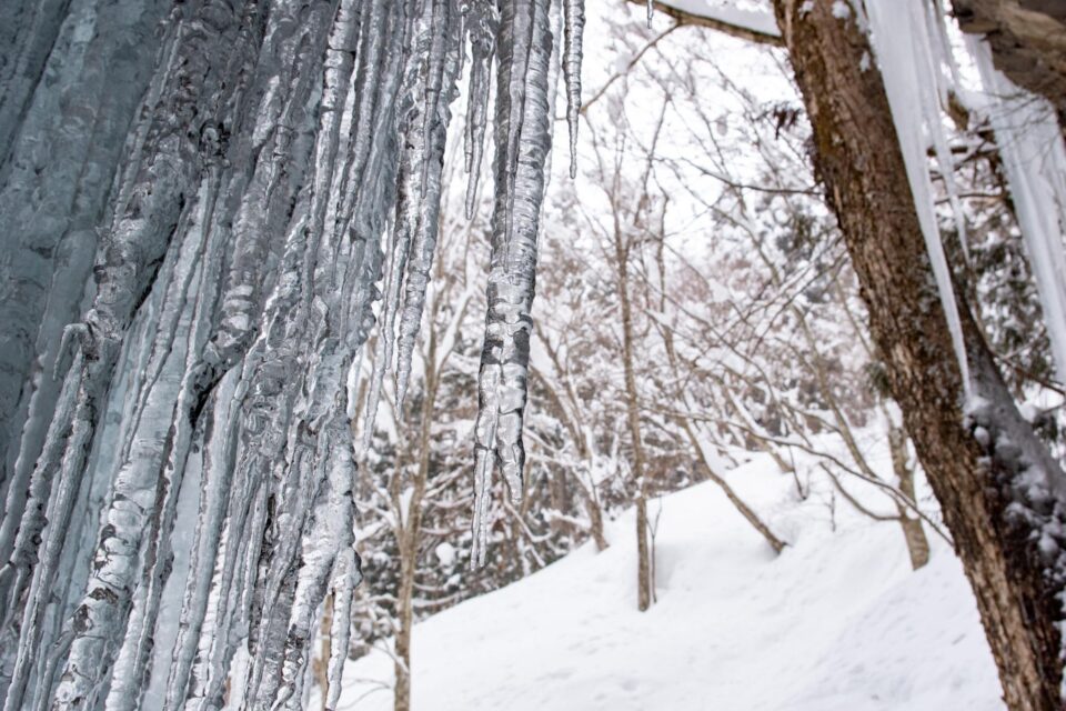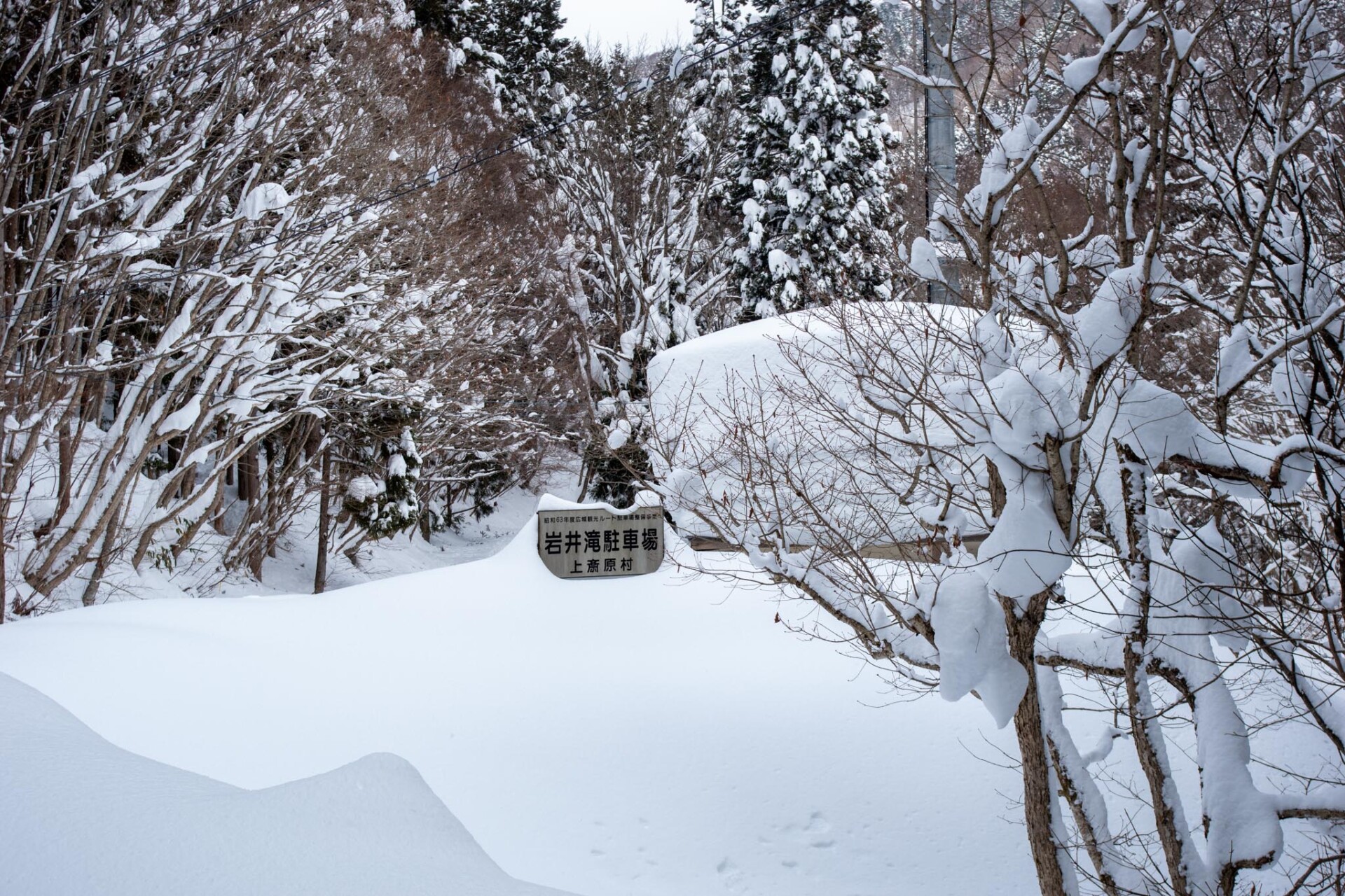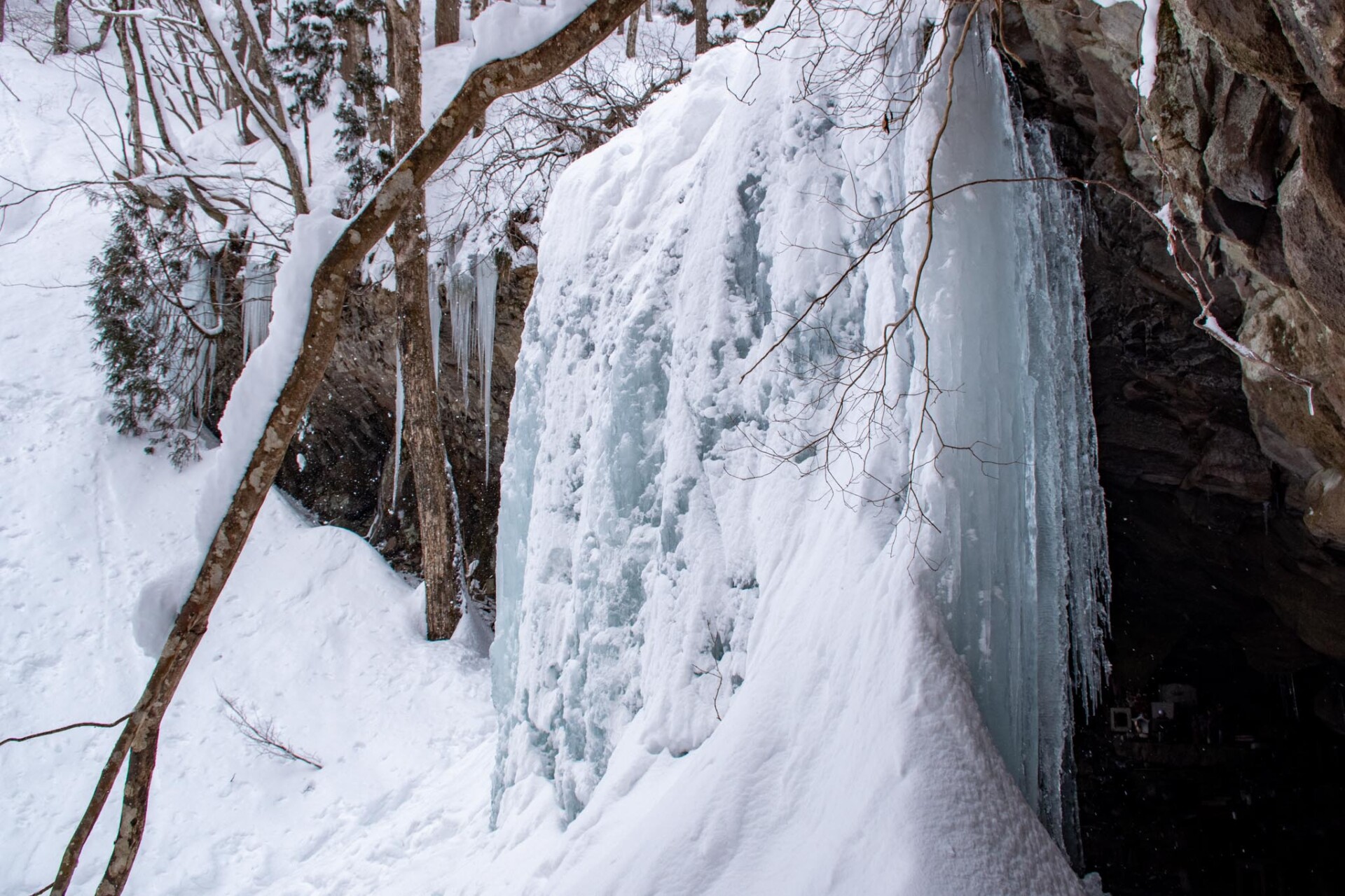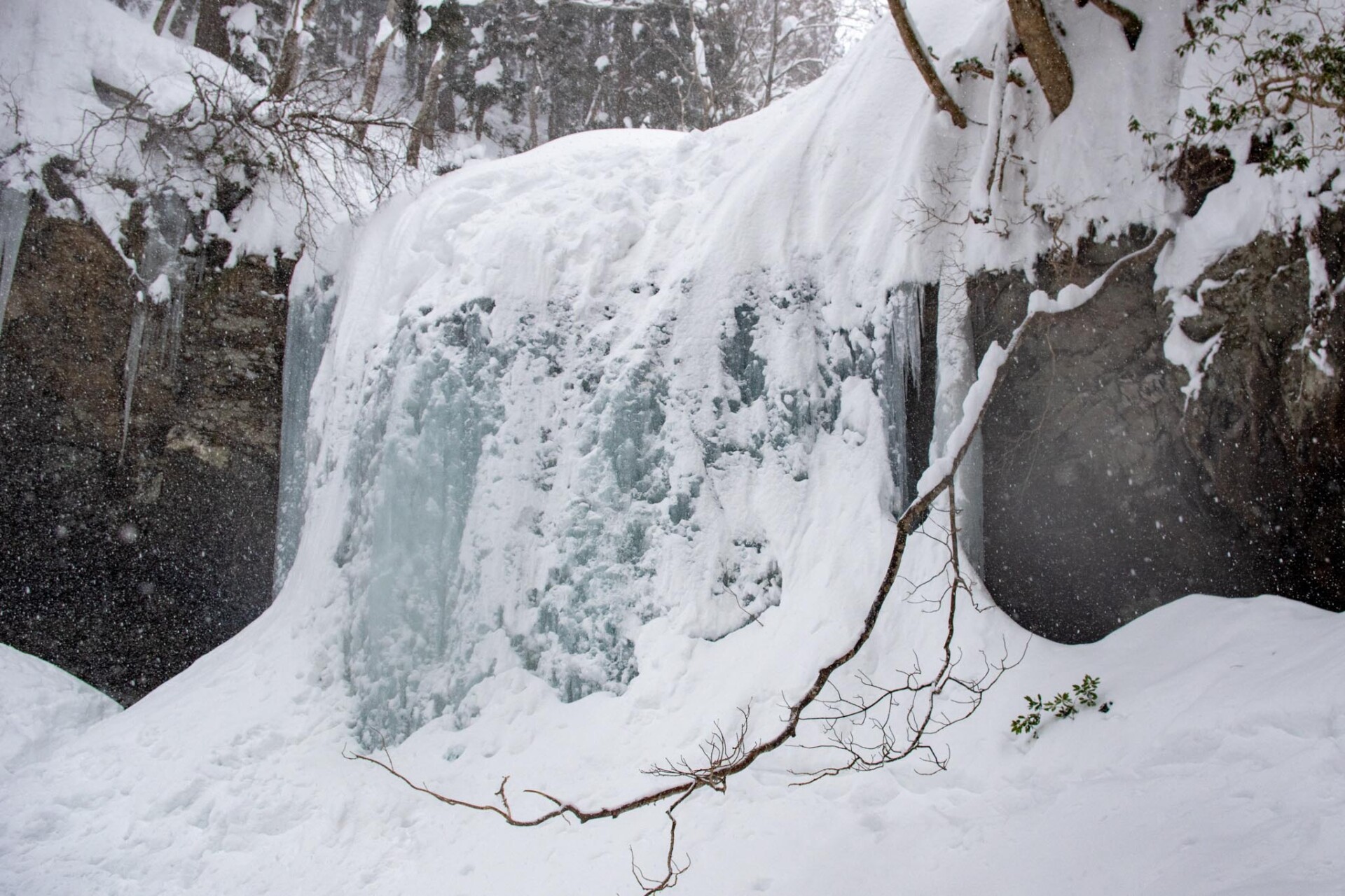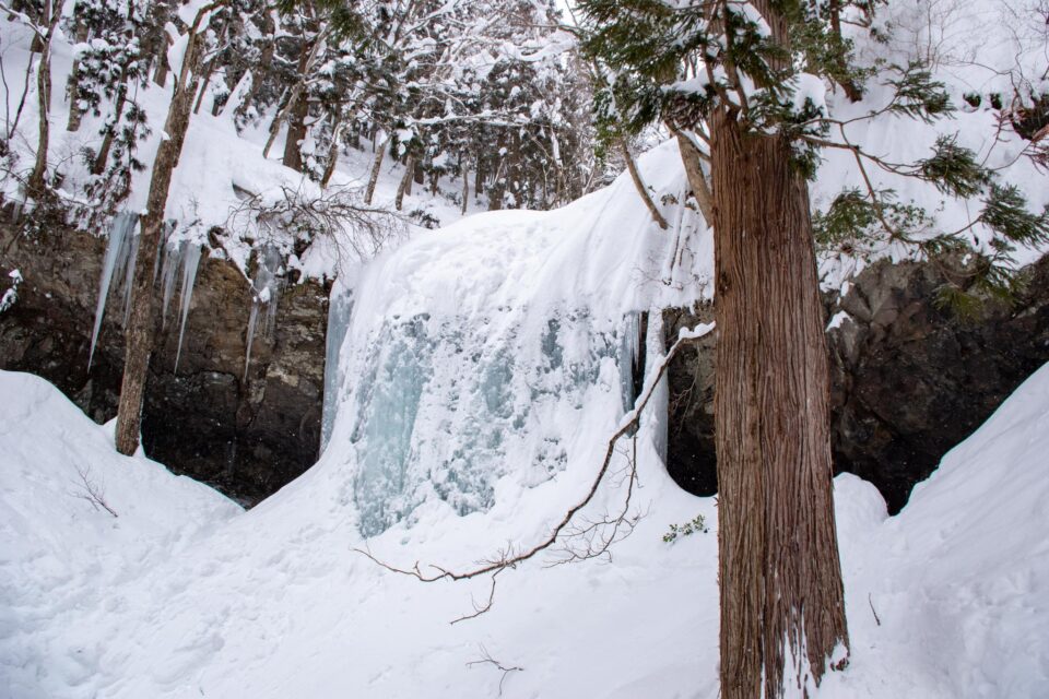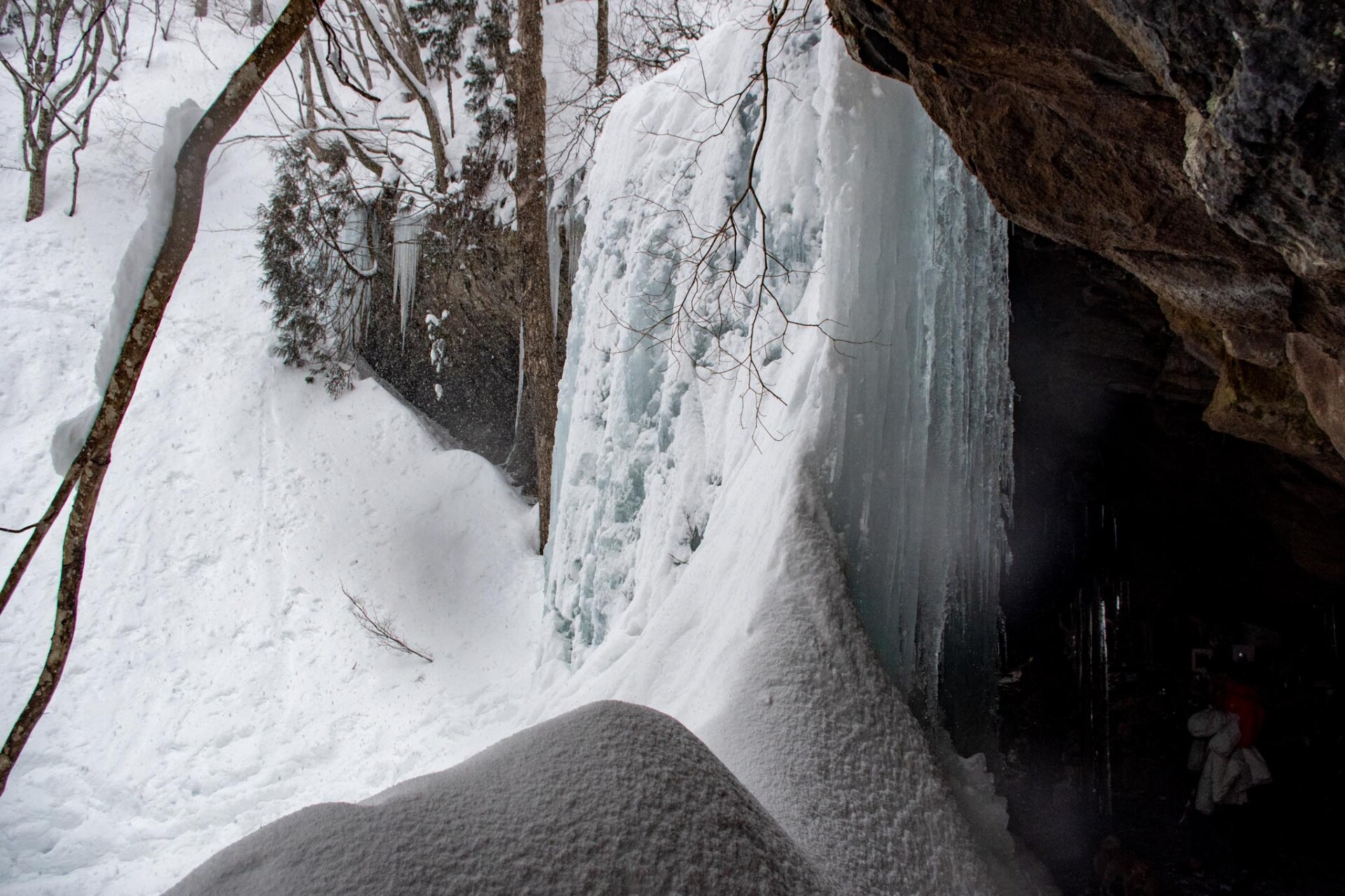 無雪期は滝のすぐ下に駐車場があるのでアクセスが容易ですが、積雪期は車道が途中から除雪されていないので車で近くまで行けません。