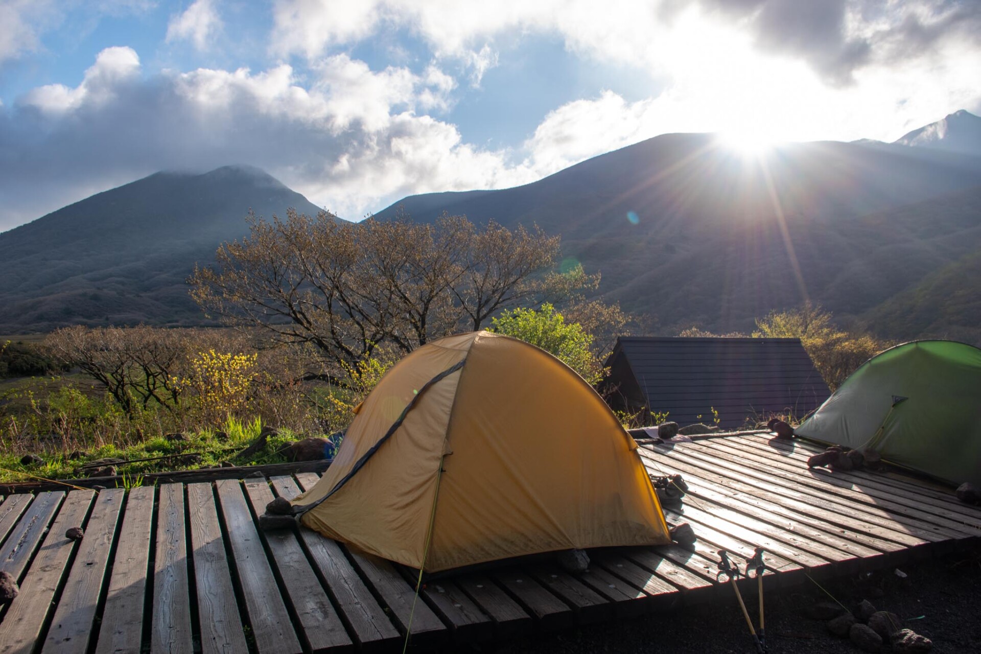 法華院温泉山荘のテン場はデッキだからペグがさせず、岩でガイロープを押さえているだけ。強風で倒壊しないか不安だったけど、無事、朝を迎えられて良かった。