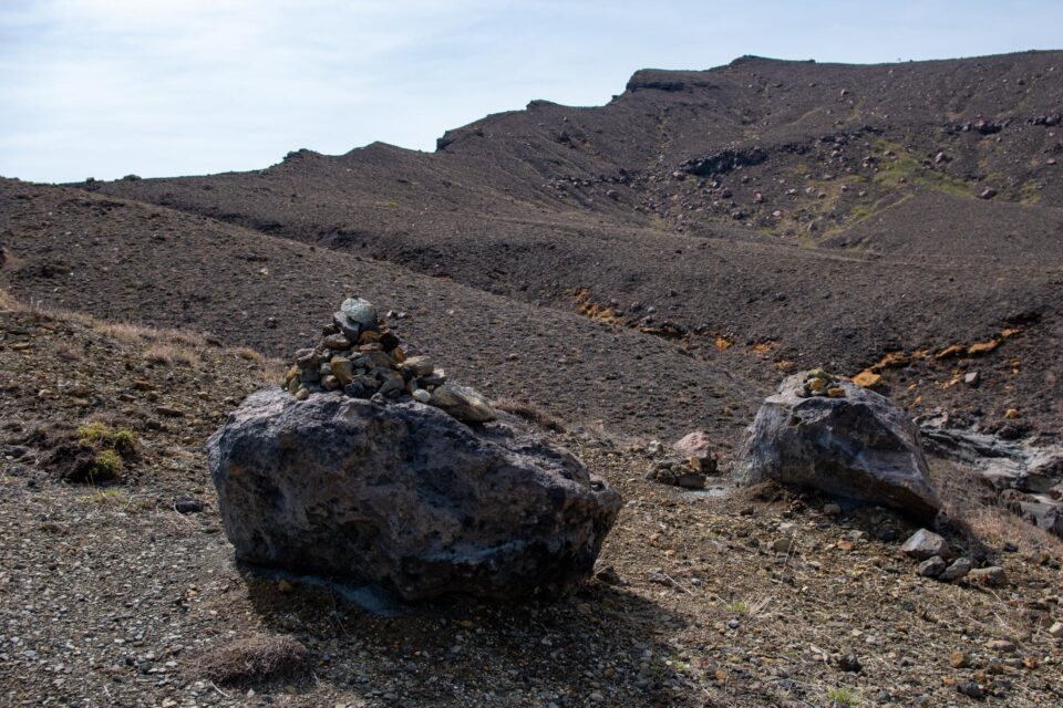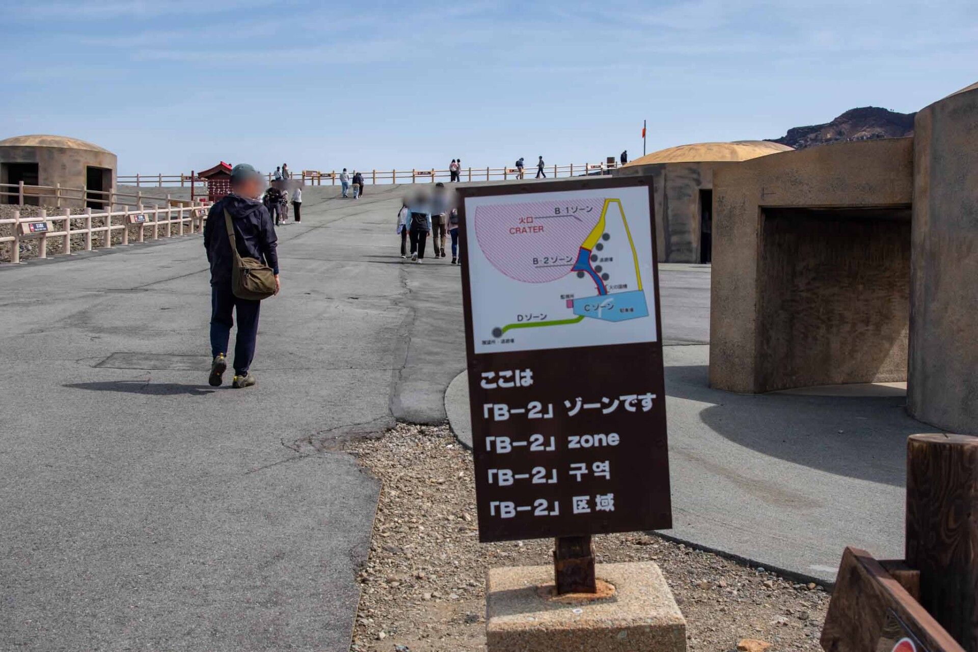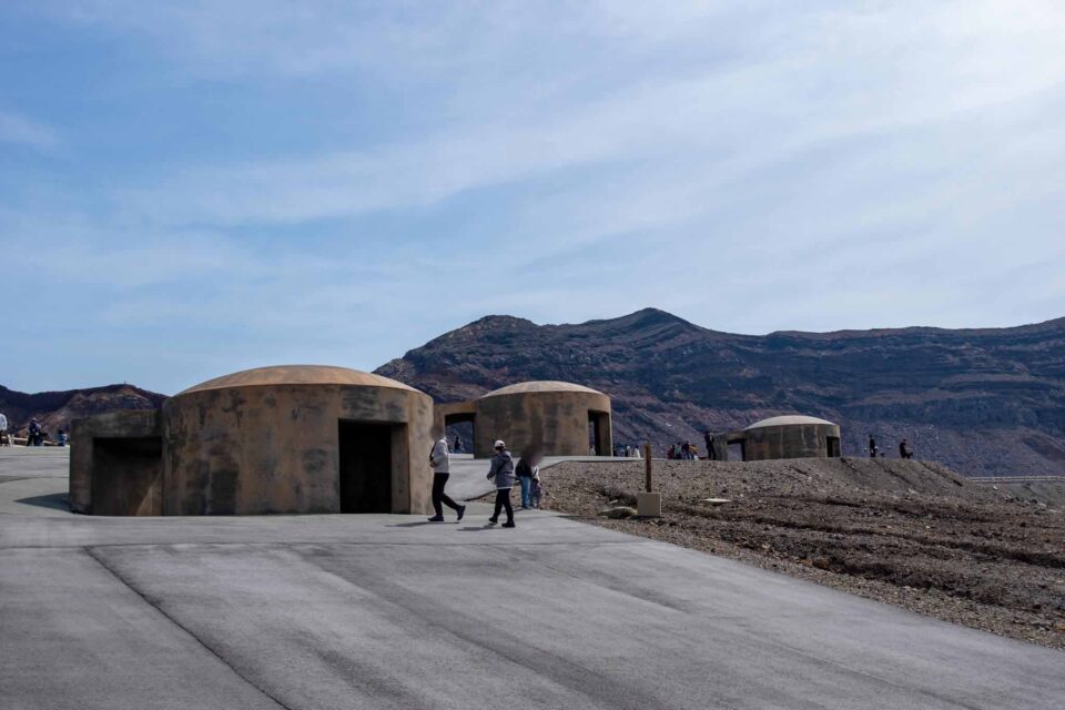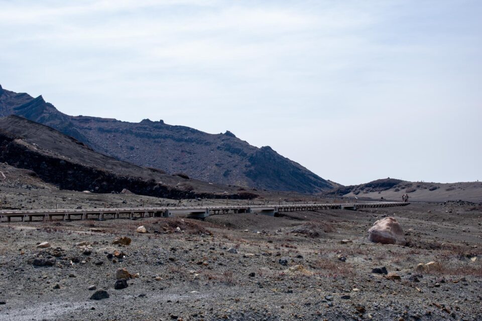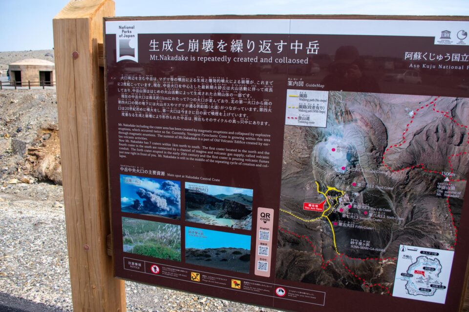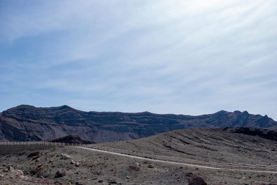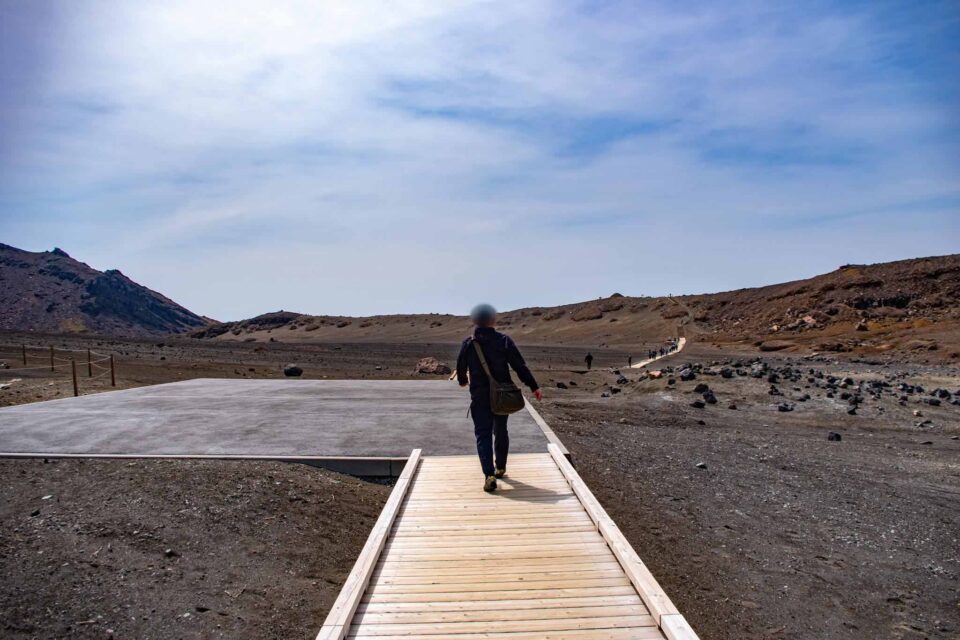 その中でも、今でも噴煙をあげており時々噴火することもある山が中岳です。噴火警戒レベルが低く、火山ガスの発生がなく、天候が良いときだけ、火口の見学ができます。この日は一部のエリアを除き見学OK。