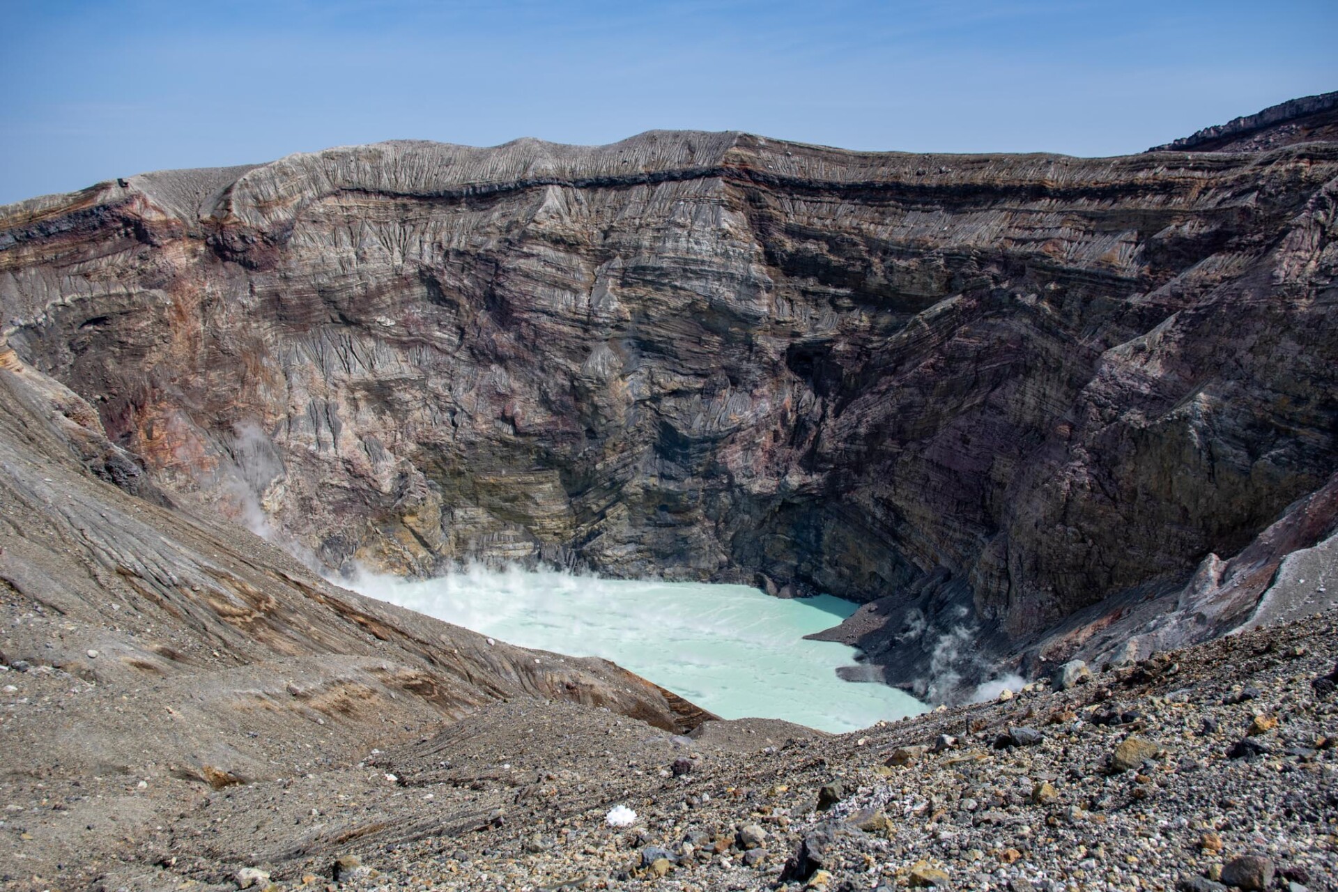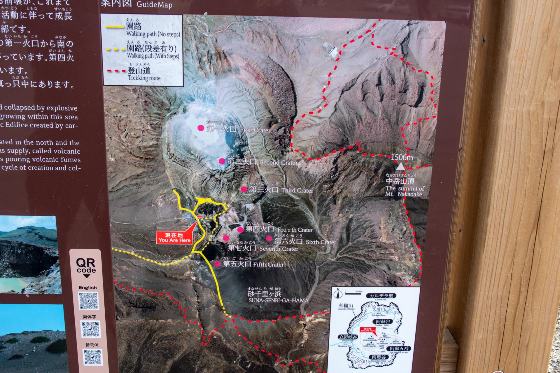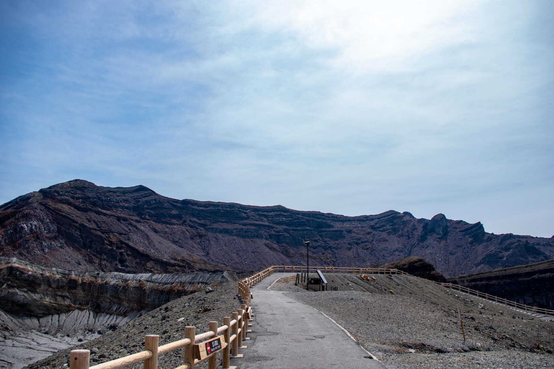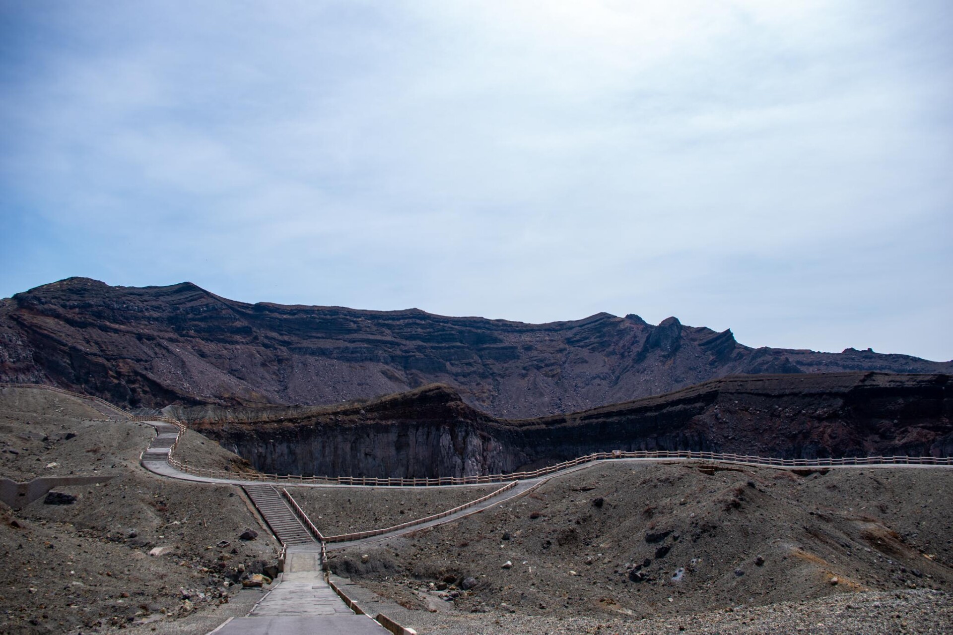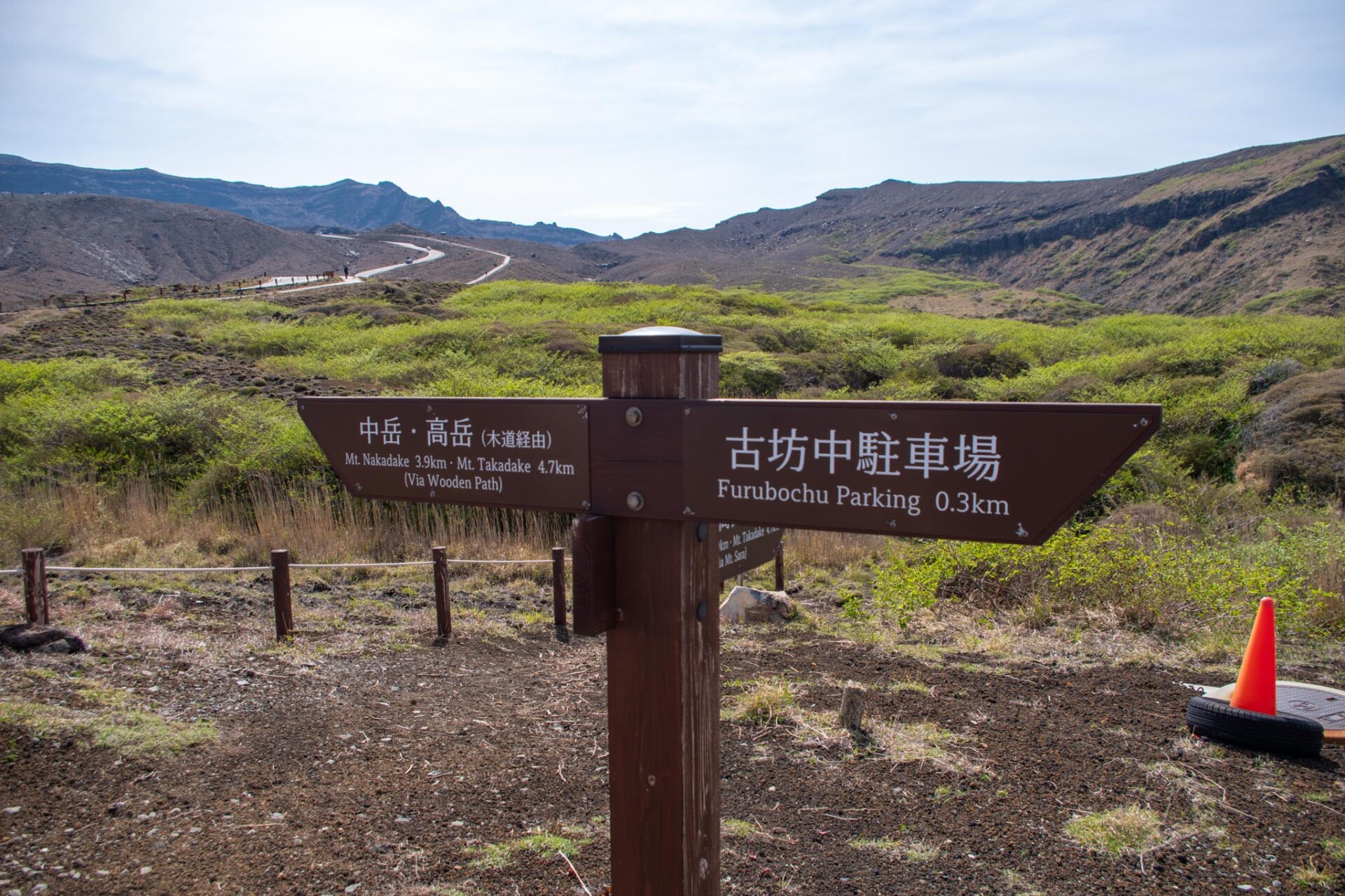 その中でも、今でも噴煙をあげており時々噴火することもある山が中岳です。噴火警戒レベルが低く、火山ガスの発生がなく、天候が良いときだけ、火口の見学ができます。この日は一部のエリアを除き見学OK。