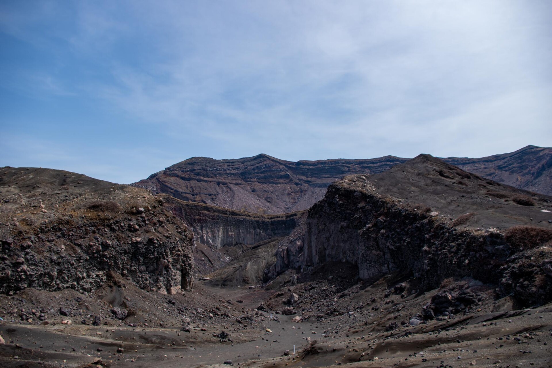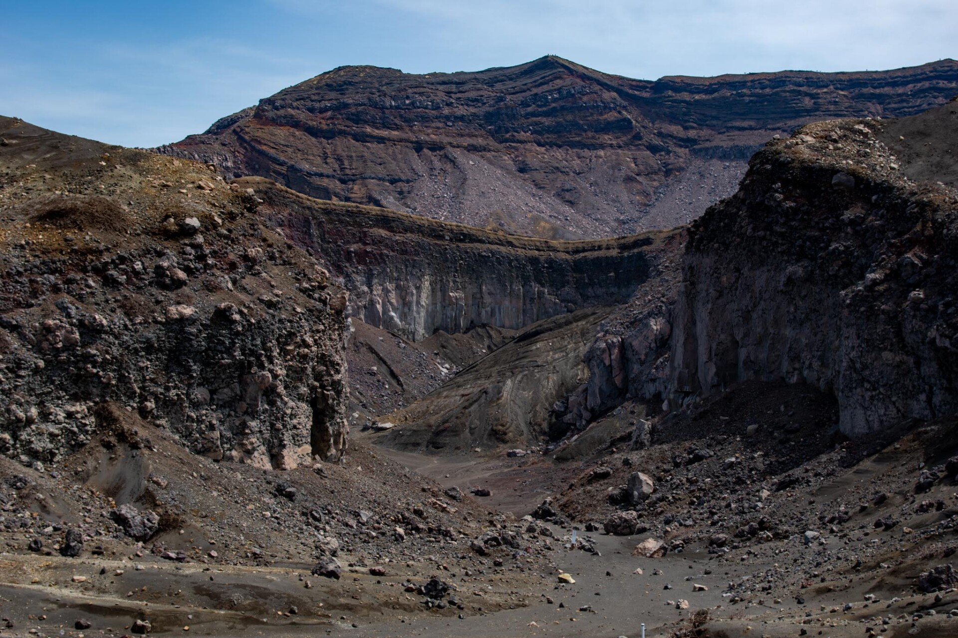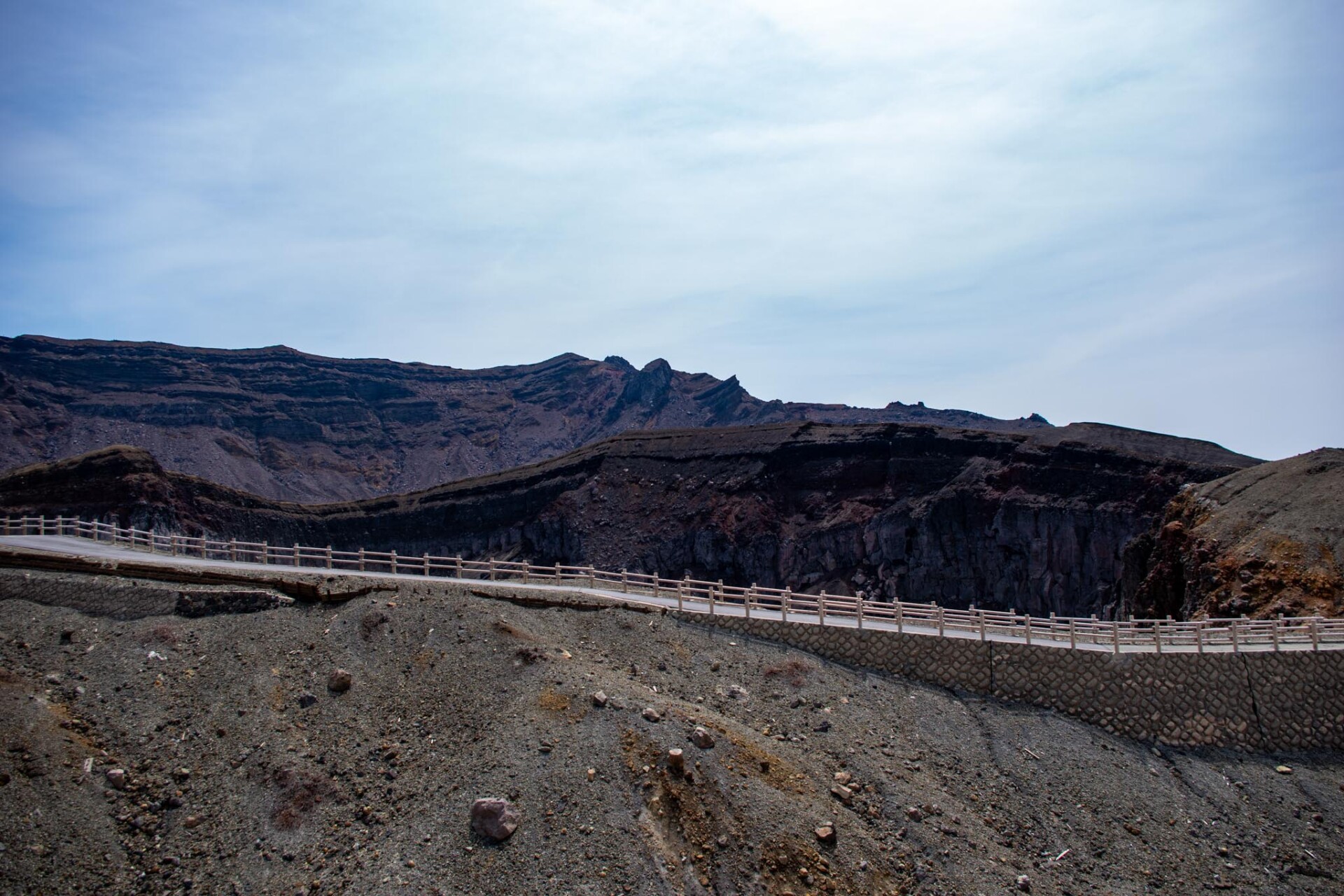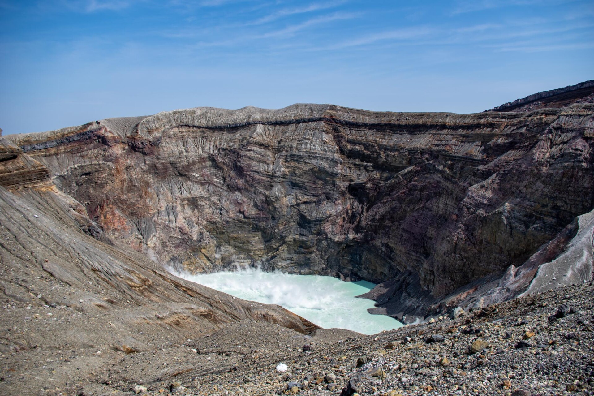 その中でも、今でも噴煙をあげており時々噴火することもある山が中岳です。噴火警戒レベルが低く、火山ガスの発生がなく、天候が良いときだけ、火口の見学ができます。この日は一部のエリアを除き見学OK。