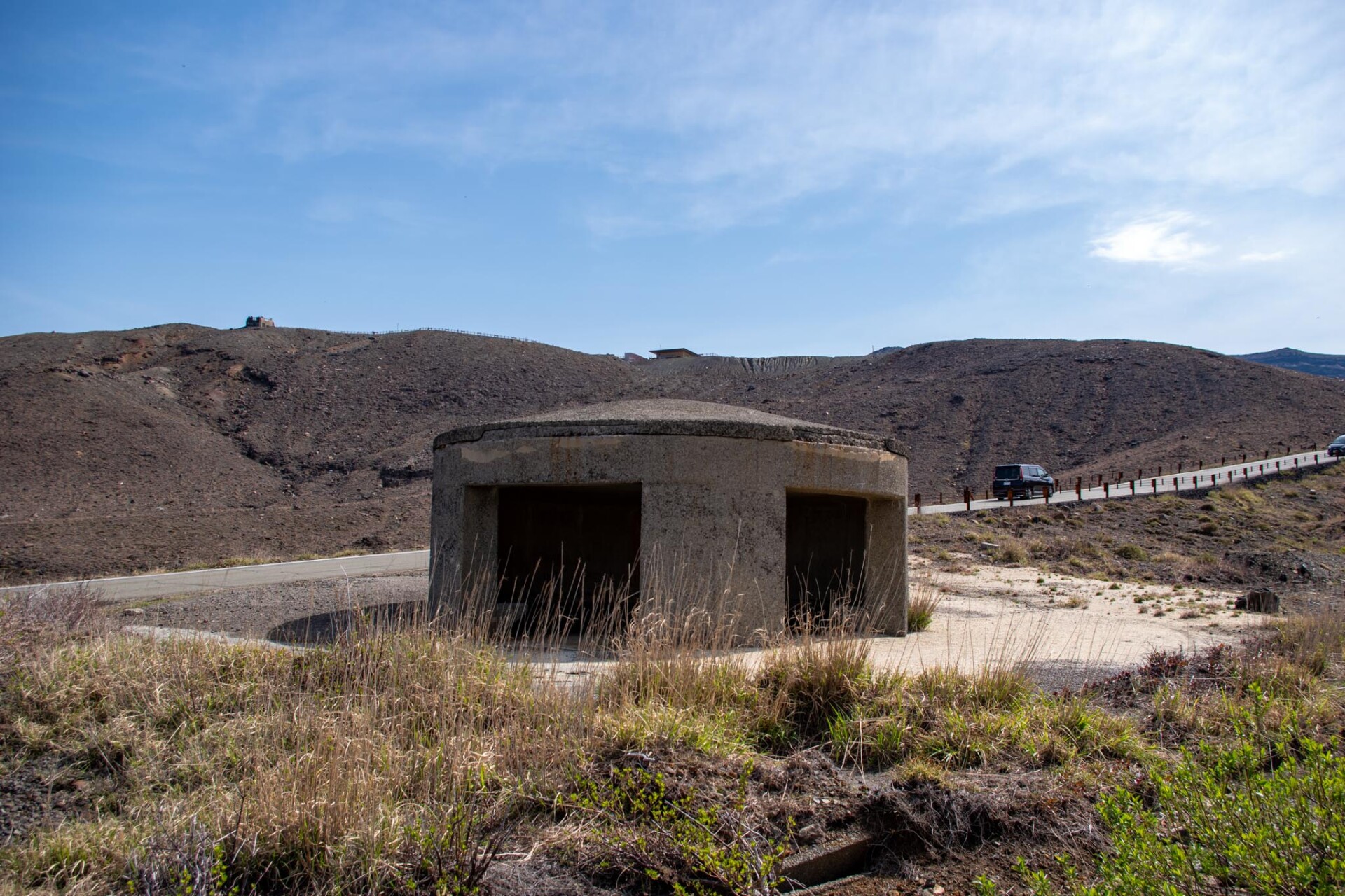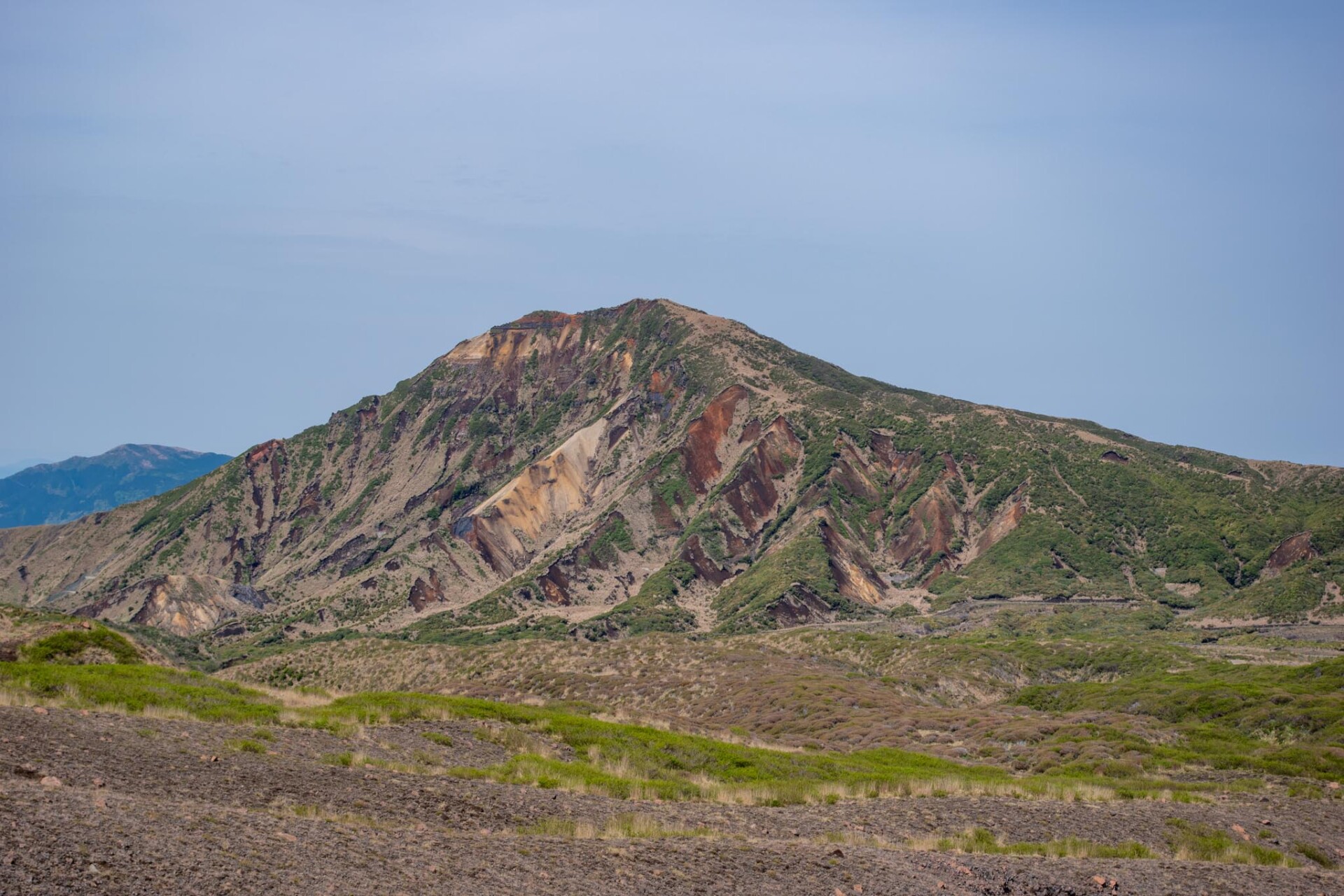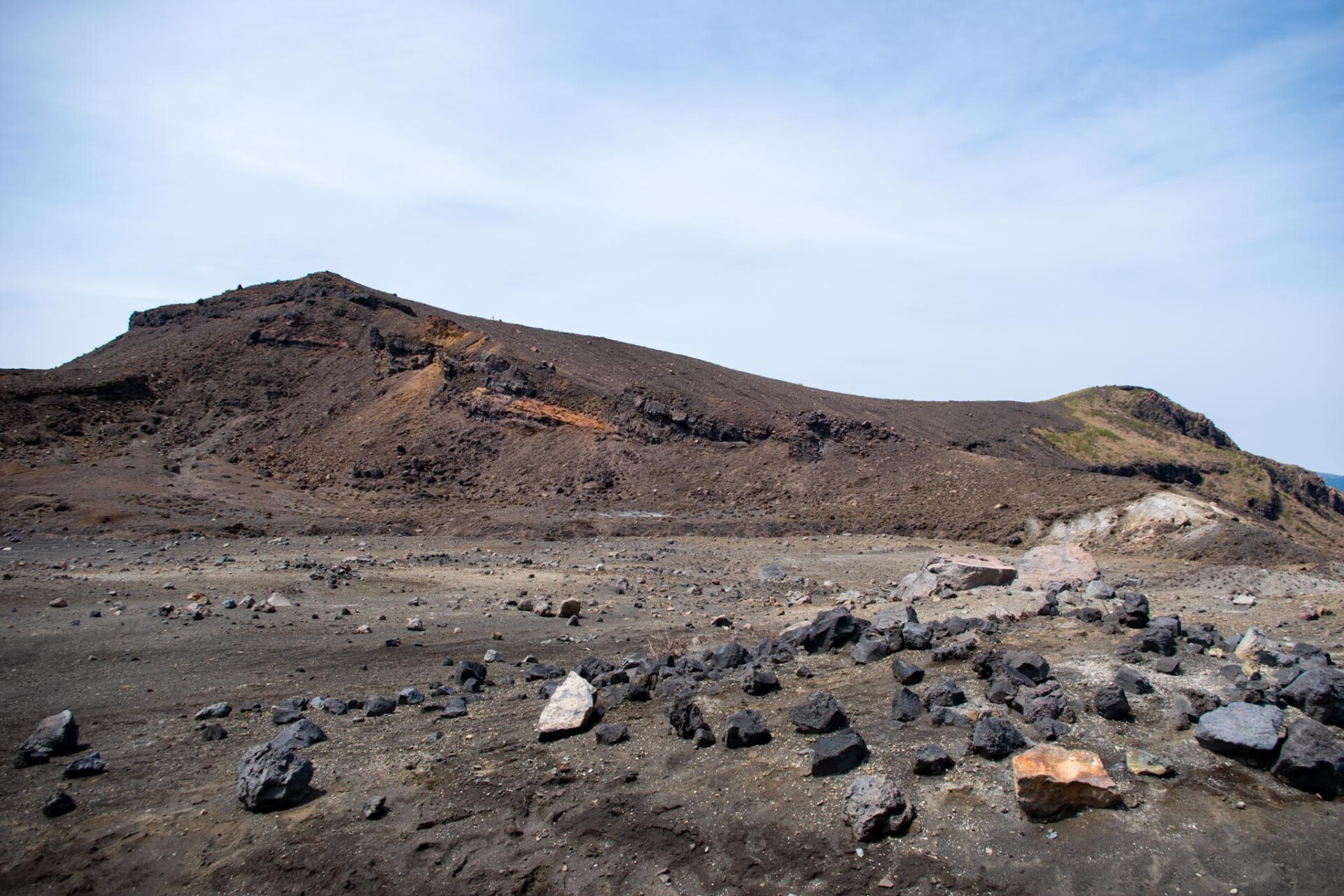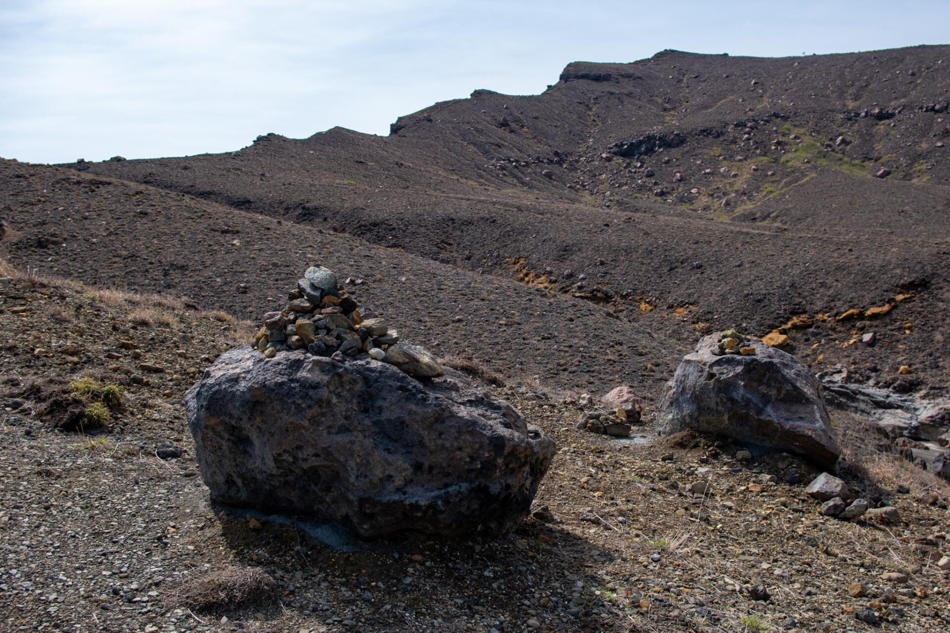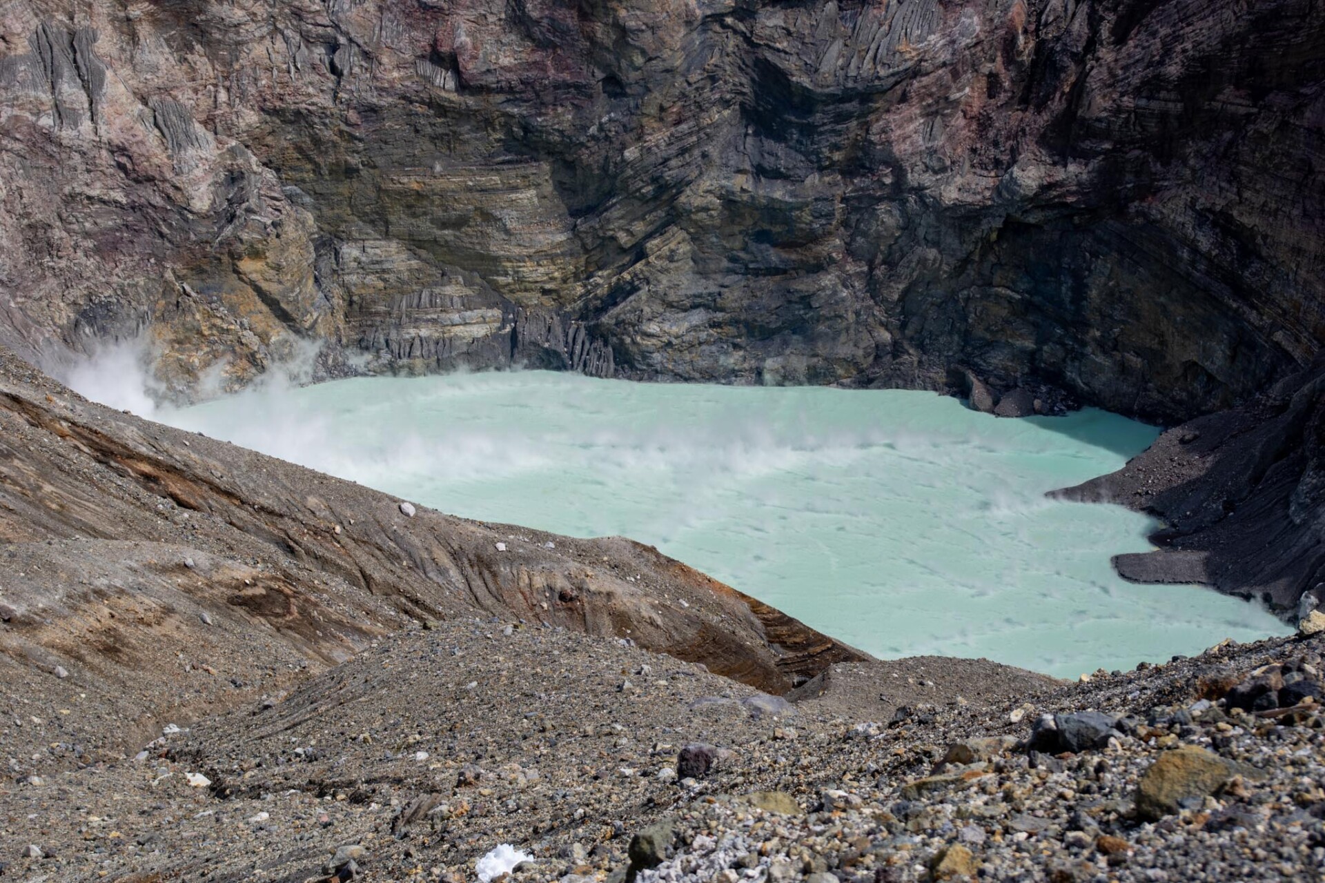 その中でも、今でも噴煙をあげており時々噴火することもある山が中岳です。噴火警戒レベルが低く、火山ガスの発生がなく、天候が良いときだけ、火口の見学ができます。この日は一部のエリアを除き見学OK。